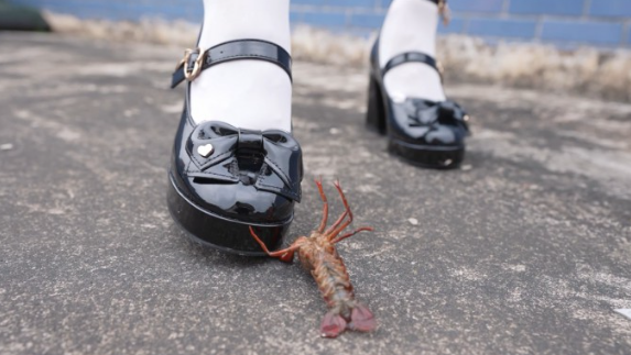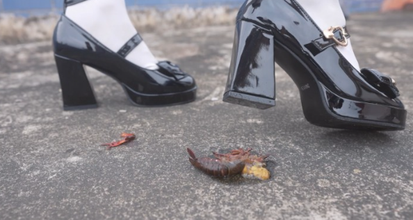 优美冷酷的姿态踩小龙虾,先踩断双臂,再用鞋后跟踩扁头部,最后踩至爆浆